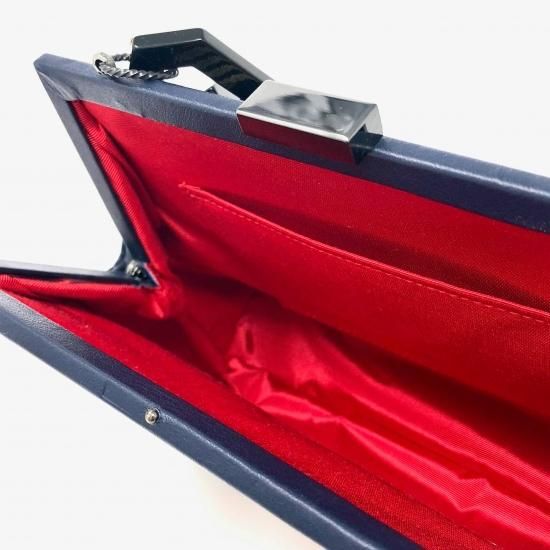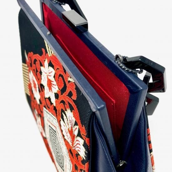 素材:表地…アンティーク帯(正絹),牛革(紺) 裏地…合繊グログラン、付属…アクリル、金属